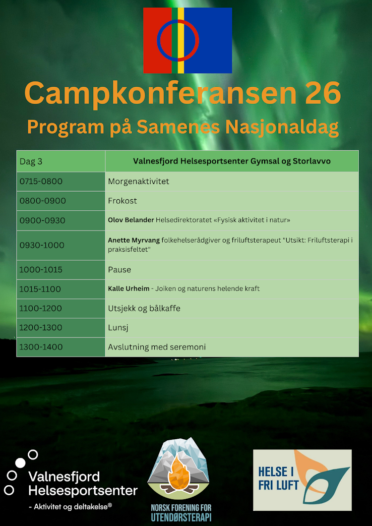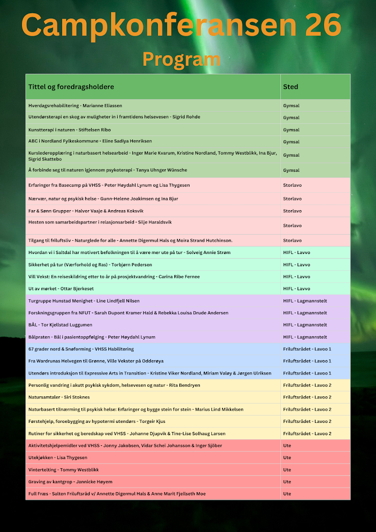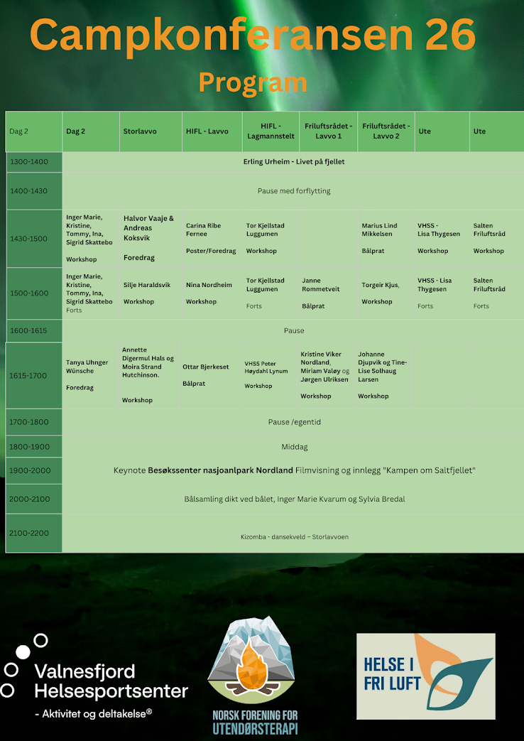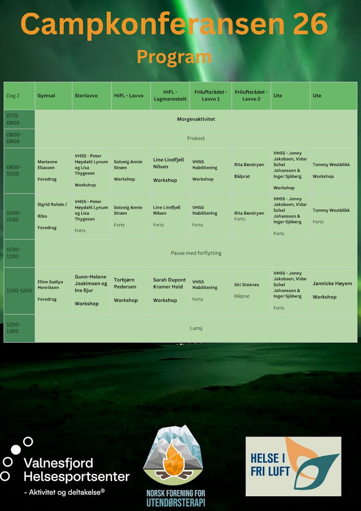 Denne uka har vi endelig publisert et detaljert program for Campkonferansen 2026. Et program vi er veldig stolte av - og ikke minst gleder oss til å delta på. Både på onsdag og fredag vil programmet foregå i plenum - da får vi god til til å være i lag og bygge vennskap og nettverk. Torsdagens workshoper og innlegg vil foregå på 8 parallelle stasjoner; gymsal, lavvoer og utendørs. Ut fra hvor mange som melder seg på de ulike workshopene kan plasseringen justeres - da lavvoene har ulike størrelse. (Dersom det er få personer som melder seg på noen av workshopene vil vi og vurderer å avlyse dem). Påmelding til workshop/parallelle foredrag vil kunne gjøres i forbindelse med når du ankommer og registrere deg på konferansen - her kan det bli vanskelig å velge hva man skal delta på, da ALT ser spennende ut, i våre øyne! Torsdagen avsluttes i plenum med en fantastisk filmvisning, påfølgende av bålsamling og dansekveld i storlavvoen.